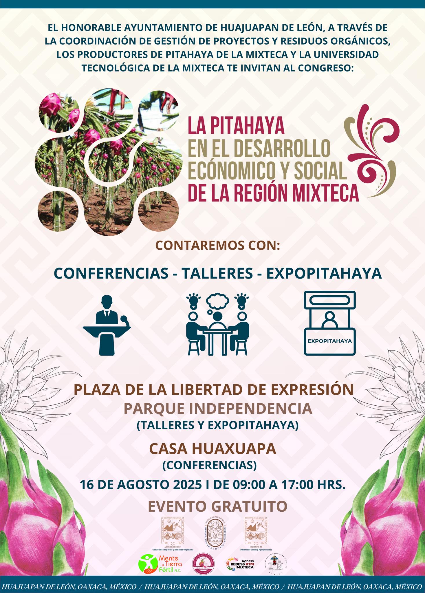 Huajuapan de León, Oax.- El Honorable Ayuntamiento de Heroica Ciudad de Huajuapan de León, a través de la Coordinación de Gestión de Proyectos, los Productores de Pitahaya de la Mixteca y la Universidad Tecnológica de la Mixteca, invitan al Congreso: “La pitahaya en el desarrollo económico y social de la Región Mixteca” que se realizará […]